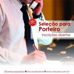 A Santa Casa de Misericórdia de Sobral divulgou edital de abertura do processo seletivo para o cargo de Porteiro. As inscrições deverão ser realizadas de 3 a 8 de setembro, no site www.stacasa.com.br. A seleção tem como objetivo a formação de cadastro de reserva para profissionais com ensino médio completo e formação na área de vigilância.