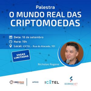 O ICETEL será palco nesta quarta-feira, 18 de setembro, as 19h, da palestra O mundo real das Criptomoedas, apresentada pelo consultor de ativos digitais Nicholas Rogene. O acesso é gratuito e as vagas limitadas.