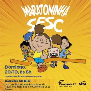 Em comemoração ao Dia das Crianças, o Sesc, braço social do sistema Fecomércio-CE, promove para as crianças atividades de lazer e cultura durante todo o mês de outubro. Em Sobral, o destaque vai para a Maratoninha Sesc que acontece no domingo do dia 20, a partir das 6h30, com largada no Estacionamento da Escola Educar Sesc, na Rua Dom Lourenço, nº 855.