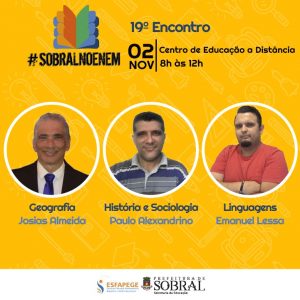 No próximo domingo (03/11), será o primeiro dia de prova do Exame Nacional do Ensino Médio (Enem). Os estudantes do projeto #SobralnoEnem terão, no sábado (02/11), as últimas horas de estudo antes da prova. A partir das 8h, será realizado o 19° encontro do projeto com aulas de Geografia com o professor Josias Almeida, de História e Sociologia com o professor Paulo Alexandrino e, de Português com o professor Emanuel Lessa. O encontro será realizado no auditório do Centro de Educação a Distância do Ceará (CED).
