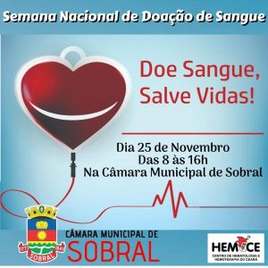 A Câmara de Sobral vai promover campanha de Doação de Sangue, no próximo dia 25 de novembro. Presidente do legislativo, Carlos do Calisto, aprovou para este mesmo dia, com o apoio dos demais vereadores, uma Sessão Especial para homenagear o Dia dos Doadores de Sangue.
