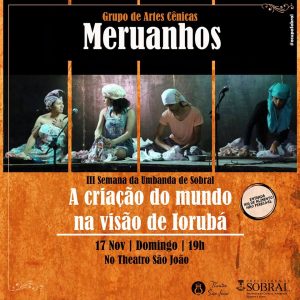 Neste domingo (17) o Theatro São João recebe o espetáculo “A Criação do Mundo na Versão Iorubá” a partir das 19h30. A classificação é livre, então já temos encontro marcado! A apresentação do espetáculo é parte integrante da programação da III Semana da Umbanda de Sobral.