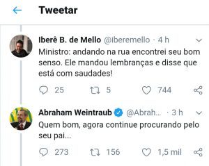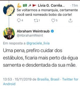 As postagens geraram reação dos internautas que acusavam o ministro de desconhecer a história do País. O ministro chegou a responder alguns comentários de maneira bastante agressiva. Uma internauta posta a Weintraub: “Se voltarmos à monarquia, certamente vocês será nomeado bobo da corte”. Ao que o ministro responde: Uma pena, prefiro cuidar dos estábulos, ficaria mais perto da égua sarnenta e desdentada da sua mãe”.