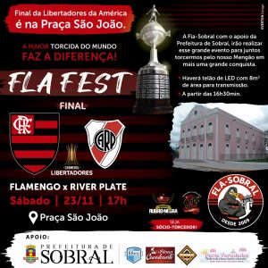 Neste sábado (23) o consulado Fla-Sobral, com o apoio da Prefeitura de Sobral, irão realizar a transmissão da final da libertadores num telão de 8m2 na praça São João, o evento dará início partir das 16h30.