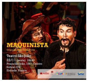 Nesta sexta-feira, 22 de novembro, o grupo Pavilhão da Magnólia (Fortaleza) apresenta o espetáculo “Maquinista”, no Theatro São João de Sobral, às 19h30, com acesso gratuito.