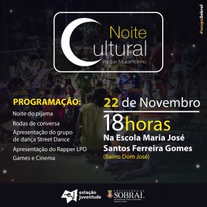 A Noite Cultural contará com apresentações de dança e rap, noite do pijama, games e cinema. Haverá também rodas de conversa sobre anime / mangá / cosplay, com Ingrid Kelly; “Movimente-se: a importância da dança”, com Vernielle Ferreira; “Movimento hip hop Sobral: 20 anos de história”, com Clodoaldo e Rapper LPO; e “Racismo: um preconceito que gera desigualdade” e “Empoderamento feminino e LGBT: que visibilidade nós queremos?”, com Street Dance.