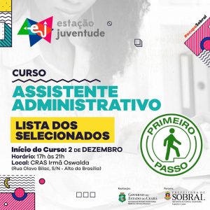 A Estação Juventude Novo Recanto torna pública nesta segunda-feira (25) a Lista de Selecionados para o curso de Assistente Administrativo, oferecido em parceria com o SESC – Sobral.