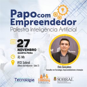A Prefeitura de Sobral, por meio da Secretaria do Trabalho e Desenvolvimento Econômico (STDE), realizará a 6ª edição do Papo Empreendedor, nesta quarta-feira (27/11), com o tema “Inteligência Artificial”, com o consultor em Tecnologia, Empreendedorismo e Inovação, Elvis Gonçalves. O encontro acontecerá às 14 horas, no IFCE Sobral (bloco da Indústria – Sala 2). A palestra abordará os impactos da Inteligência Artificial no mercado atual e nos próximos anos, os benefícios e desafios enfrentados pela área em seu desenvolvimento no Brasil e no mundo.
