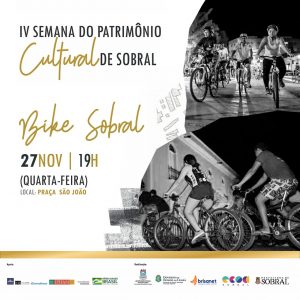 A Prefeitura de Sobral, por meio da Secretaria da Cultura, Juventude, Esporte e Lazer (Secjel), realizará, nesta quarta-feira (27/11), mais uma edição do passeio ciclístico “Bike Sobral”. Será uma edição especial em alusão à Semana do Patrimônio Cultural de Sobral. Com concentração a partir das 19 horas, na Praça do Theatro São João, o passeio percorre as principais ruas da cidade, em um percurso de 15 km, com uma parada para hidratação.