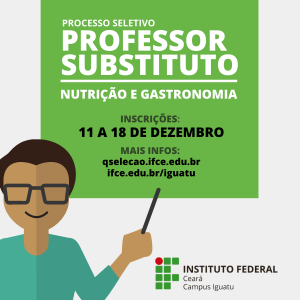 O IFCE Campus Iguatu abriu inscrições, até dia 18 de dezembro, para o Processo Seletivo de contratação temporária de professores substitutos. O edital prevê duas vagas, uma na área de Gastronomia (subárea: Habilidades e Técnicas Culinárias) e outra de Nutrição (subárea: Dietética).