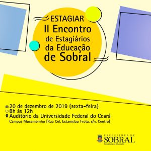 A Secretaria da Educação de Sobral realizará, no dia 20 de dezembro, o II Estagiar – Encontro de Estagiários da Educação de Sobral. O evento acontecerá das 8h às 12h, no auditório da Universidade Federal do Ceará (UFC), campus Mucambinho.