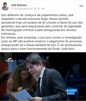 O senador Cid Gomes subiu na tribuna do Senado Federal no dia 17 de setembro e comunicou ao plenário que estava apresentando Projeto de Lei propondo ao Brasil a criação da figura do juiz de garantias. “Sou defensor da justiça e de julgamentos justos, que respeitem o devido processo legal. Nesse sentido apresentei hoje, 17/09, um Projeto de Lei criando a figura do juiz das garantias, que será responsável pelo controle da legalidade da investigação criminal e pela salvaguarda dos direitos individuais. Ou seja, o juiz que conduz a investigação junto ao Ministério Público, não poderá conduzir o julgamento do processo, garantido a imparcialidade do juiz. É um pressuposto básico para o bom funcionamento do Pose Judiciário”, escreveu Cid à época no na sua página no Facebook.