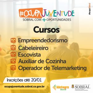 A Prefeitura de Sobral, por meio da Secretaria do Trabalho e Desenvolvimento Econômico (STDE), abre, nesta quinta-feira (09/01), as inscrições para novos cursos dos projetos Capacita Sobral e Sobral Empreendedor, que integram o programa #ocupaJuventude. Serão ofertados os cursos de Cabeleireiro, Escovista, Auxiliar de Cozinha, Operador de Telemarketing e Empreendedorismo. As inscrições vão até o dia 20 de janeiro.