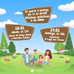 O Clima de Férias invadiu o Sobral Shopping com muita felicidade e diversão e trouxe várias oficinas gratuitas de slimes e artísticas, de quarta a domingo, das 17h as 20h30. No próximo sábado (18), as 17h, tem shows com Baby Shark e Patrulha Canina! E no domingo (19), a partir das 18h, tem a apresentação do ballet ‘Lago dos Cisnes’, na praça de alimentação.