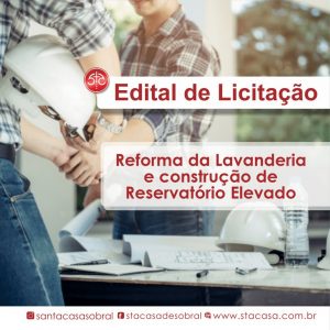 A Santa Casa de Misericórdia de Sobral (SCMS) divulga edital de licitação do tipo menor preço para contratação de empresa especializada na execução de obras de construção civil para a reforma da Lavanderia e construção de um Reservatório Elevado, divididos em dois lotes. A documentação exigida no edital deverá ser entregue na Central de Projetos do Hospital ou enviada até às 17 horas do dia 28 de janeiro de 2020 para o e-mail: [heloisa@stacasa.com.br].
