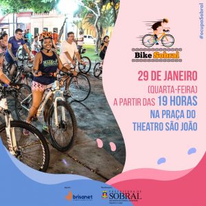 A Prefeitura de Sobral, por meio da Secretaria da Cultura, Juventude, Esporte e Lazer (Secjel), realiza, nesta quarta-feira (29/01), mais uma edição do passeio ciclístico “Bike Sobral”. Com concentração a partir das 19 horas, na Praça do Theatro São João, o passeio percorre as principais ruas da cidade. O Bike Sobral conta com o apoio das Secretarias da Segurança e Cidadania (Sesec), da Saúde e BrisaNet.