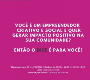 Com o apoio da Prefeitura de Sobral, por meio da Secretaria do Trabalho e Desenvolvimento Econômico (STDE), o Serviço Brasileiro de Apoio às Micro e Pequenas Empresas (Sebrae) realizará nessa quinta e sexta-feira, dias 30 e 31 de janeiro, na sede do Sebrae de Sobral, uma nova turma do primeiro módulo do Programa DICE – Desenvolvimento de Economias Criativas e Inclusivas.