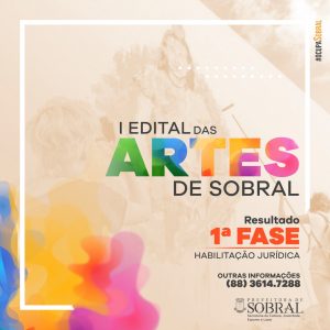 A Prefeitura de Sobral, por meio da Secretaria da Cultura, Juventude, Esporte e Lazer (Secjel) e do Instituto Ecoa, divulga o resultado da 1ª fase do I Edital das Artes de Sobral. Os desabilitados terão o prazo de 5 dias para protocolar o pedido de recurso. A solicitação deve ser realizada de forma presencial, por meio da entrega dos documentos na Comissão Permanente de Licitação da Prefeitura (Rua Viriato de Medeiros, 1250, 4º andar).