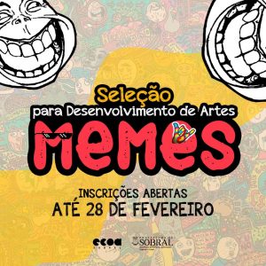 A Prefeitura de Sobral, através da Secretaria da Cultura, Juventude, Esporte e Lazer (Secjel) e do Instituto Ecoa, lança a Seleção para Desenvolvimento de Artes – Memes. A seleção tem cunho cultural e de cidadania com caráter de inovação e utilidade pública e se organiza em quatro categorias: 1. Memes – no formato 1000×1000 pixels; 2.Stickers – no formato PNG; 3. GIF: máximo de 5 seg. (quadrado); e 4. Stories: máximo de 15 seg na VERTICAL.