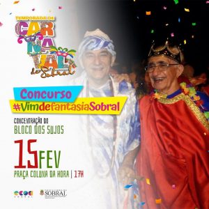 Na Temporada de Carnaval de Sobral 2020 tem concurso de fantasias com premiação! Para deixar o clima mais descontraído e colorido, acontecerá, na concentração do Bloco dos Sujos, o Concurso de Fantasias, dia 15 de fevereiro (sábado), na Praça da Coluna da hora, iniciando às 17h. Capricha na fantasia, esteja lá e concorra!