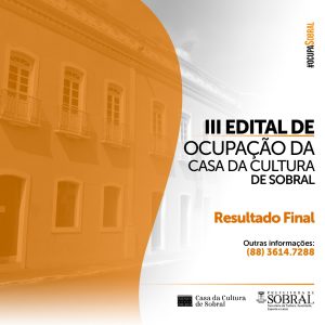 A Prefeitura de Sobral, por meio da Secretaria da Cultura, Juventude, Esporte e Lazer (Secjel), divulga, nesta sexta-feira (28/02), o resultado final do Edital de Ocupação da Casa da Cultura 2020.