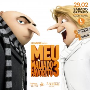 O projeto Cineminha na Casa exibe, neste sábado (29/02), às 17 horas, a animação “Meu Malvado Favorito 3”. Produzido pelo estúdio Dreamworks, o longa acompanha as aventuras de um vilão aposentado e suas três filhas. A entrada é gratuita e a classificação indicativa livre.