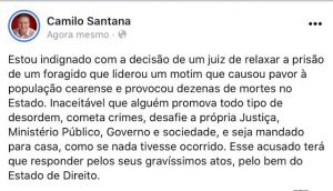 O governador Camilo Santana ficou indignado com o juiz Roberto Bulcão que liberou o Cabo Sabino que estava com mandado de prisão decretado pela própria justiça. Acusado de ter promovido o motim que parou a Policia Militar por vários dias causado “dezenas de mortes”, Sabino foi liberado pelo juiz de custódia que avaliou que a greve tinha acabado e não julgou o mérito do processo. O governador publicou sua indignação nas redes sociais.