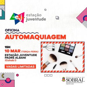 A Estação Juventude Padre Albani recebe, nesta terça-feira (10), às 15 horas, uma oficina de automaquiagem. As inscrições são gratuitas e devem ser realizadas presencialmente na sede da Estação (Rua Manoel Torres, Cohab I), onde os interessados devem comparecer portando documentos oficiais (RG e CPF). Vagas limitadas.