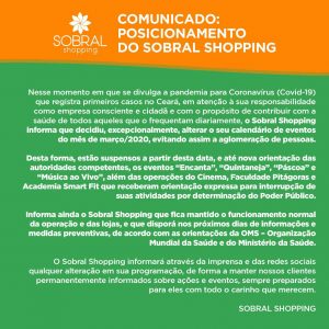 Para evitar a aglomeração de pessoas, o Sobral Shopping cancelou a programação dos eventos corriqueiramente realizados na praça de alimentação de quinta a domingo. O funcionamento segue normal para lojas, quiosques e restaurantes. A Faculdade Pitágoras, as salas de cinema Multicine e academia Smart Fit estarão fechadas.