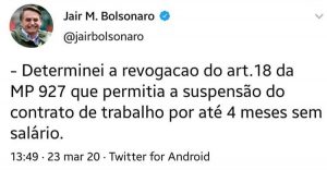 “Determinei a revogação do art.18 da MP 927, que permitia a suspensão do contrato de trabalho por até 4 meses sem salário”, escreveu Bolsonaro em uma rede social.