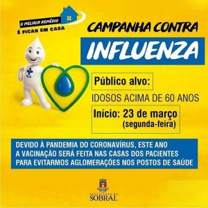 Sobral inicia nesta segunda-feira (23) a vacinação contra a gripe para crianças entre seis meses e 5 anos, idosos a partir de 60 anos e trabalhadores da saúde. Segundo a secretária de Saúde, Regina Carvalho, a meta é vacinar pelo menos 90% de cada um dos grupos prioritários, e esse trabalho será feito em domicilio usando o programa de georeferenciamento disponível no município. “Não precisa ninguém, muito menos os idosos irem ao posto de saúde. Iremo atá a casa deles. Fiquem em casa”, afirmou Regina. A vacina previne contra três tipos de vírus Influenza, sendo dois do tipo A (H1N1 e H3N2) e um do tipo B.