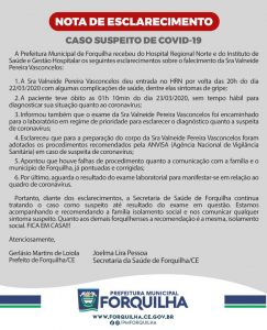 O prefeito de Forquilha, Gerlásio Loiola, se manifestou na rede social Facebook sobre o caso de falecimento de uma moradora da comunidade de Rasteira, na zona rural do município, que faleceu no HRN nesta segunda-feira (23) e que teve sua morte atribuída pela imprensa sobralense como sendo vitima do Covid-19. Segundo o prefeito, o diretor geral do Hospital Regional Norte, Dr Daniel Hardy Melo, ligou informando que o exame laboratorial da Sra. Valneide Pereira Vasconcelos foi NEGATIVO para Covid-19. A secretaria da Saúde de Forquilha emitiu comunicado sobre o caso.