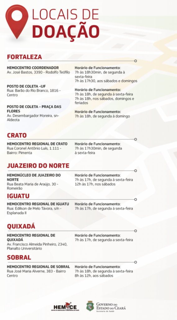 O Centro de Hematologia e Hemoterapia do Ceará (Hemoce), da rede pública do Governo do Ceará, ampliou os horários de atendimento dos postos de coleta de sangue. Para evitar aglomerações nos locais, o voluntário deve fazer o agendamento online da doação. As medidas são para melhorar o acesso da população e oferecer mais segurança durante o período da quarentena de combate ao coronavírus.