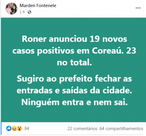 O Município de Coreaú viu o número de casos de Covid-19 explodir nas últimas 24 horas segundo informações dadas pelo prefeito da cidade, Carlos Roner, e confirmada pelo advogado coreauense Mardem Fontenele. Com a chegada de testes rápidos de testagem enviados pelo Governo do Estado, o município saltou de 4 para 23 casos, sendo 19 detectados apenas nesta terça-feira (21). Segundo informações do Blog Coreaú de Fato, esse número poderá aumentar, já que o resultado oficial uma vez que mais testes ainda estão sendo realizados. O bairro São Miguel é o foco do coronavirus em Coreaú. De 25 testes aplicados, 19 deram positivo.