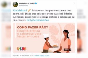 O Ministério da Saúde acaba de divulgar os números de mortes por Covid-19 nas últimas 24 horas. Foram 338 mortes. Desde o início da pandemia, 4.443 mortos. Enquanto o número de mortes por coronavírus cresce, o Ministério da Saúde aposta nas “habilidades culinárias” dos brasileiros e ensina “receitas práticas e saborosas de pão caseiro”, conforme o tuíte acima postado hoje.
