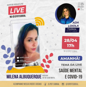 Nesta terça-feira (28) a partir das 17 horas, a psicóloga e especialista em saúde mental. Milena Albuquerque, bate um papo com a presidente da Juventude Socialista do PDT de Sobral, Ada Loiola, sobre o tema: ‘Saúde mental em tempos de COVID-19’. Será ao vivo no Instagram da JS PDT Sobral (@jspdtsobral). O momento também vai servir para tirar as dúvidas das juventudes e do público em geral, sobre como manter a saúde mental neste momento de pandemia e isolamento social.