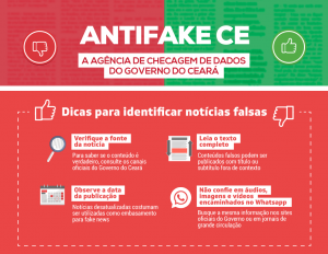 O Governo do Estado do Ceará lança nesta quarta-feira (29/04) a Antifake CE, uma agência oficial para checagem de dados e estabelecimento da verdade em temas ligados à administração pública estadual. O objetivo da plataforma online é combater de forma rápida e objetiva a propagação de notícias imprecisas, exageradas ou mentirosas – as chamadas fake news – que possam levar desinformação aos cearenses.