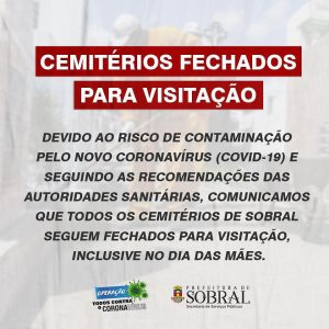 Por meio da Secretaria dos Serviços Públicos, a Prefeitura informa que todos os cemitérios de Sobral (sede e distritos) seguem fechados para visitação, inclusive no Dia das Mães, que neste ano será celebrado no próximo domingo (10/05). A recomendação é que as homenagens sejam realizadas em casa, sem aglomeração. Essa medida é necessária para conter o avanço do coronavírus.