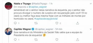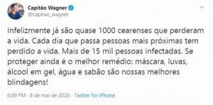 O deputado federal Capitão Wagner lamentou nesta sexta-feira (8), no Twitter, as mortes de quase mil pessoas no Ceará por coronavírus. Ele pediu que as pessoas se protejam, mas não mencionou a obediência ao decreto de isolamento social, do governador Camilo Santana e do prefeito Roberto Cláudio. Ele sugeriu se proteger usando máscara, luvas, álcool em gel, água e sabão.