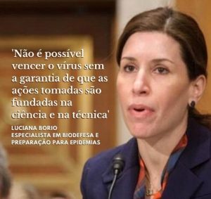 A brasileira Luciana Borio dedicou boa parte de sua carreira à construção do programa de biodefesa dos EUA, entre governos Bush, Obama e Trump. Em entrevista ao jornal Estado de São Paulo, ela conta que a sensação é de “coração partido” ao ver a defesa da cloroquina sem base científica. “Imperdoável”.