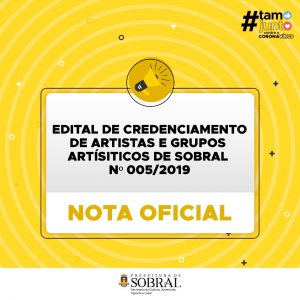 A Secretaria da Cultura, Juventude, Esporte e Lazer do Município de Sobral, informa que, em conformidade com o item 15.1 do Edital de Credenciamento de Artistas e Grupos Artísticos de Sobral nº 005/2019, publicado no Diário Oficial nº 694 de 12 de Dezembro de 2019, resolve anular o referido edital, em virtude de sua completa inviabilidade de execução, tendo em vista o momento Emergencial vivido com a pandemia da COVID-19, por ser medida de caráter emergencial e de relevante interesse público. A decisão tem por base os Decretos Municipais nº 2.371 de 16 de Março de 2020 e o nº 2.386 de 29 de Março de 2020.