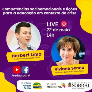 A Secretaria da Educação de Sobral promoverá, nesta sexta-feira (22), às 14 horas, uma live com o tema “Competências socioemocionais e lições para a educação em contexto de crise”, no canal da Secretaria no Youtube. O secretário da Educação de Sobral, Herbert Lima, bate um papo com Viviane Senna, presidente do Instituto Ayrton Senna, sobre a importância das competências socioemocionais no atual contexto de distanciamento social e as lições que podemos tirar para pensar a educação do futuro.