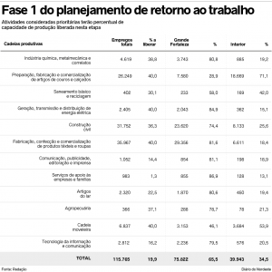 Segundo fonte que repassou os detalhes sobre a primeira fase do plano de retomada, está previsto o retorno ao trabalho de cerca de 43,2 mil trabalhadores de 12 cadeias produtivas. Com percentuais de liberação que variam de 1,3% a 40%, o planejamento ainda não tem data para começar a ser posto em prática e depende da melhora dos índices de contaminação, internação e óbitos pelo novo coronavírus.