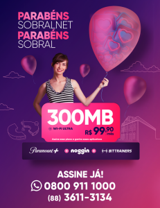 Em comemoração ao aniversário da Sobralnet e o aniversário de nossa Sobral, preparamos um presente especial para você: Na assinatura do plano de 300MB por apenas R$ 99,90 você também leva o aplicativo Bittrainer, uma academia na palma da sua mão, com diversos treinos de exercícios e dicas de nutrição. Além disso, você terá acesso ao aplicativo Paramount Plus, streaming com sucessos do cinema e diversas séries. No nosso presente de aniversário ninguém ficou de fora, a garotada terá acesso ao aplicativo Noggin, app educativo com vídeos, jogos e séries infantis desenvolvidos por especialistas com mais de 30 anos de experiência em educação.