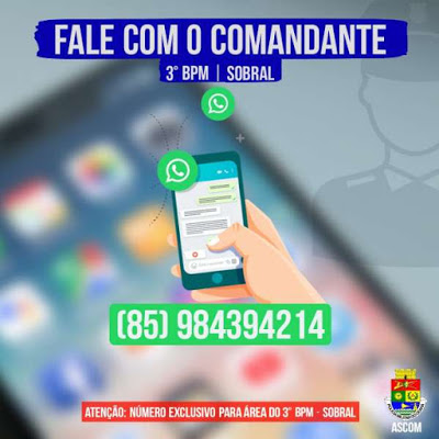 A Polícia Militar do Ceará, visando uma aproximação entre o Comando do 3º Batalhão Policial Militar e a população sobralense, disponibiliza mais uma ferramenta de comunicação, acessível a todos. O Fale com o Comandante, chega a Sobral com o intuito de estreitar esse elo com a população sobralense.