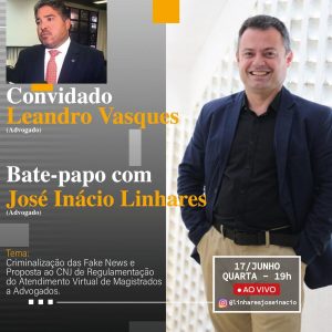 O advogado sobralense José Inácio Linhares está realizando semanalmente em suas redes sociais, uma série de bate papos, sempre as quartas-feiras, com grandes nomes do mundo jurídico. Nesta semana, a conversa é com o advogado criminalista Leandro Vasques. Na pauta, dois temas bem relevantes para a advocacia nestes tempos de pandemia: “Criminalização das Fake News” e “Proposta ao CNJ de Regulamentação do atendimento virtual de Magistrados a Advogados”.