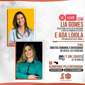 Nesta quarta-feira (17), às 18h, a JS PDT Sobral recebe de forma remota a secretária executiva de Cidadania e Direitos Humanos do Ceará, Lia Ferreira Gomes, para um bate-papo sobre “Direitos Humanos e Diversidade no Brasil da pandemia”, terá mediação de Ada Loiola, presidenta da Juventide Socialista PDT Sobral.