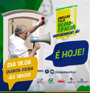 O ex-ministro Ciro Gomes (@cirogomes), presidenciável do PDT, fez uma convocação para que a sua militância participe, nas redes sociais, de um protesto nacional contra Jair Bolsonaro que ocorre nesta quinta-feira, 18. Participam do ato “Janelas Pela Democracia” os partidos PDT, PSB, PV, Rede e Cidadania.