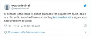 “oi pessoal, essa conta foi criada pra todas vcs q quiserem ajuda, apoio. vcs não estão sozinhas!! usem a hashtag #exposedsobral e sigam aqui caso precisem de ajuda”, diz um dos primeiros tweets.