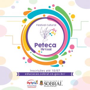Estão abertas as inscrições para o Festival Cultural Peteca Virtual 2020, promovido pela Secretaria da Educação de Sobral por meio da Brinquedoteca Municipal. As escolas municipais terão até o dia 10 de julho para realizar a inscrição dos trabalhos no festival, que será on-line devido ao período de distanciamento social.